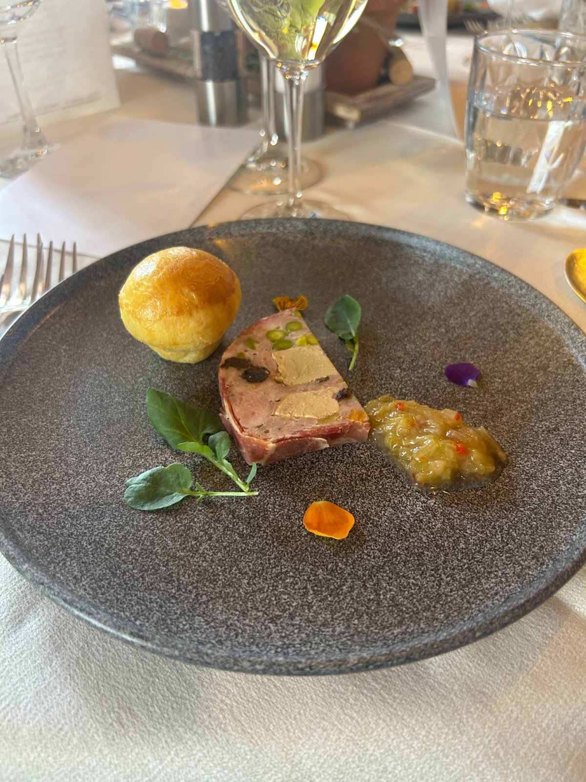 Terrine aux cailles, chutney à la rhubarbe et brioche « fait maison »