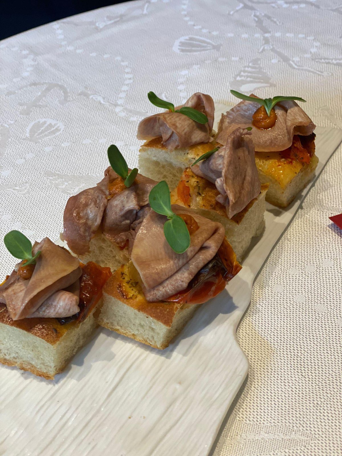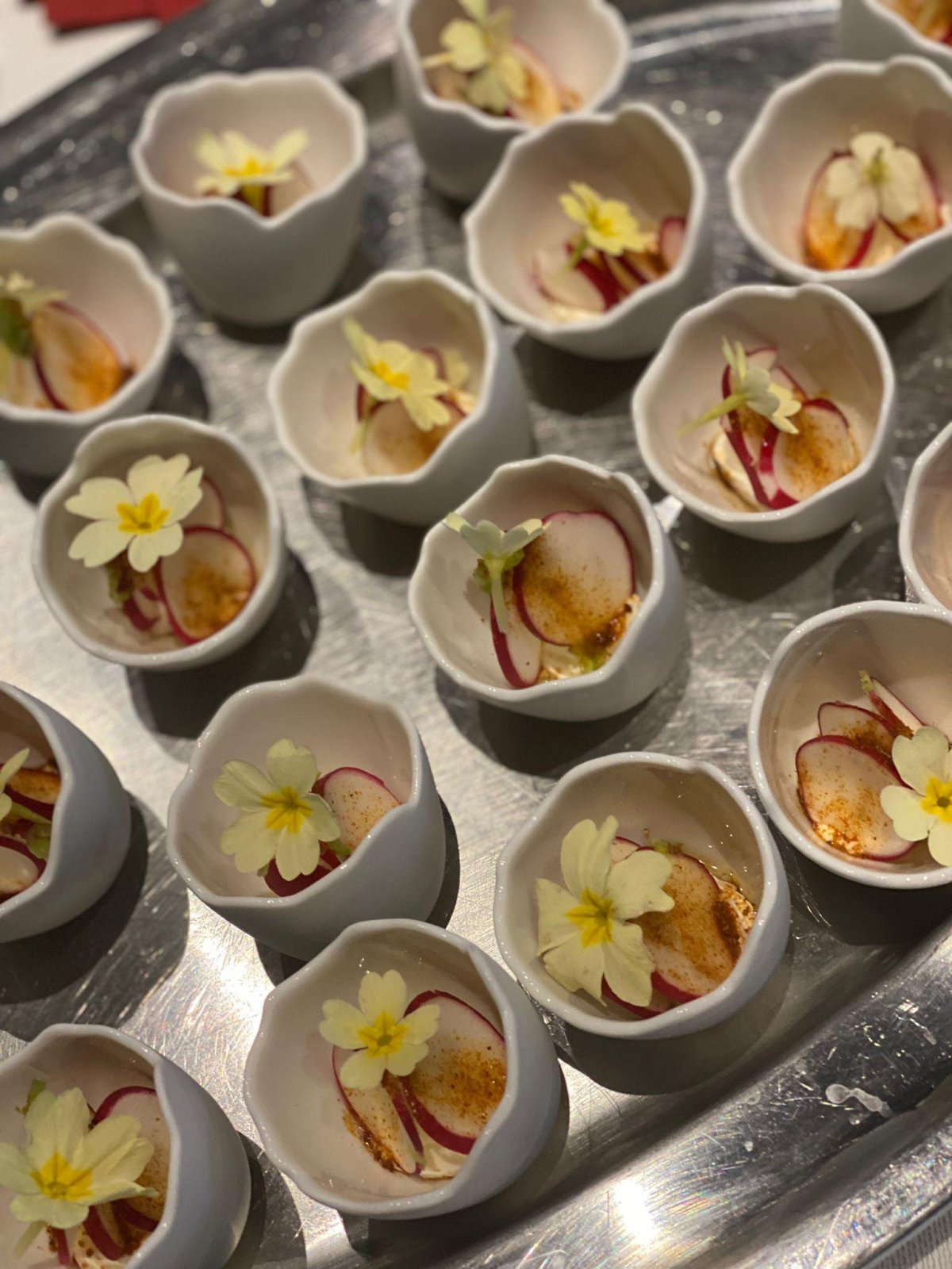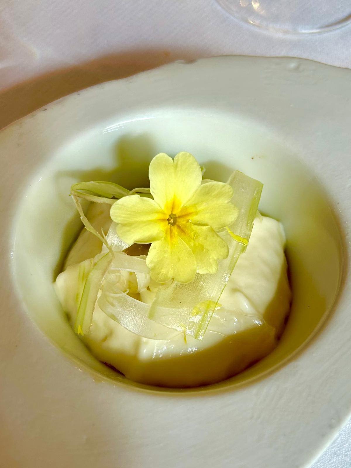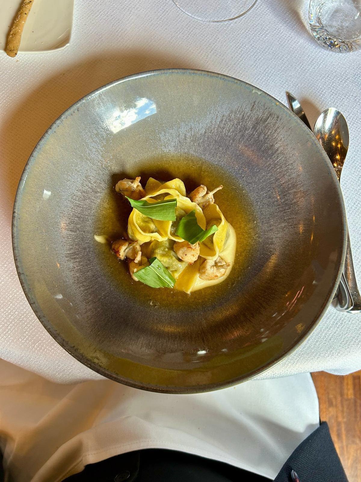 Les jambonnettes de grenouilles fraîches poêlées Purée de céleri pomme au vin de voile Tortellini au pain et herbes sauvage Bouillon végétal et pousse d’ail des ours