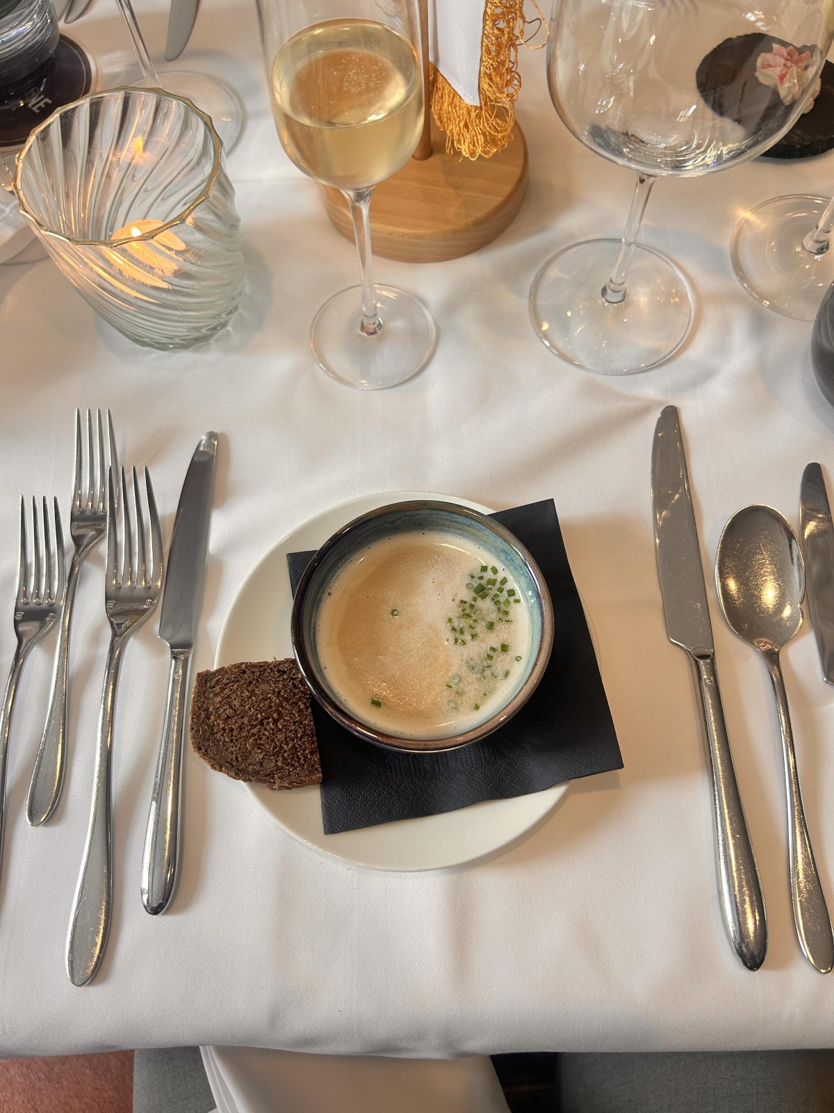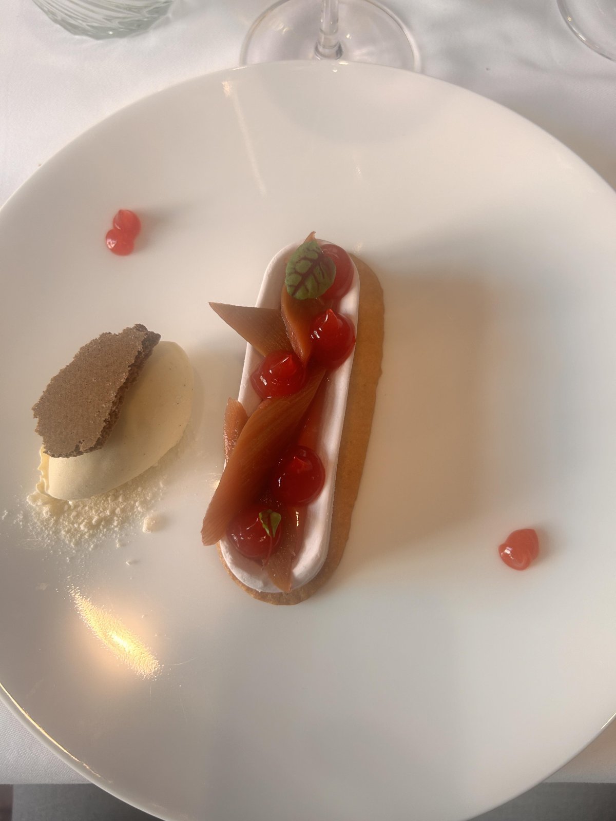 Salutations de la cuisine - Soupe au vin de Soleure. Truite fumée, fenouil, vinaigrette à l'orange et moutarde (Une tuerie!). Poulpe, artichaut, câpres, olives, piment et crémeux de pois chiches. Filet de cou de boeuf de pâturage "Omoso" en croûte d'herbes. Tripoux de Jumi de Boll, courge au poivre mariné. Rhubarbe, yaourt, sablé breton et glace aux amandes